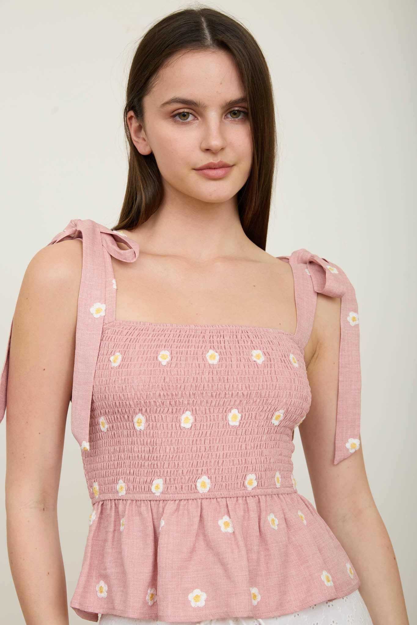 Blusa fruncida con bordado de margaritas y tirantes ajustables