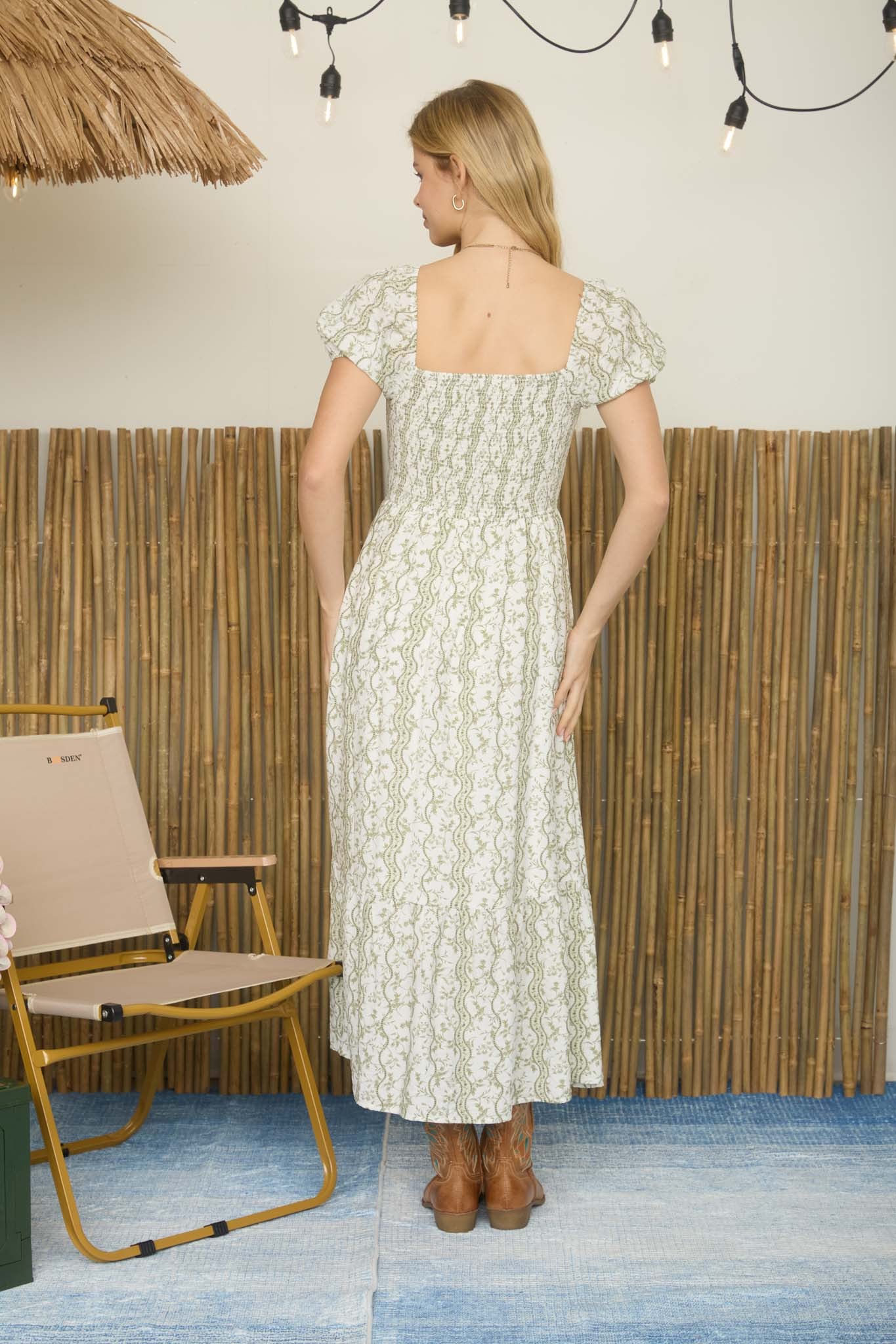 Vestido midi con patrón floral ondulado y mangas abullonadas fruncidas